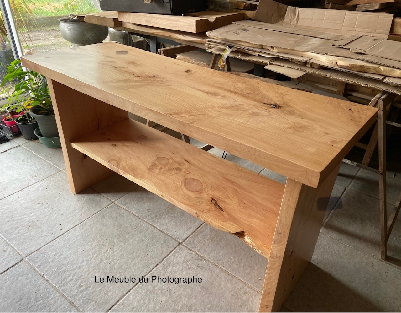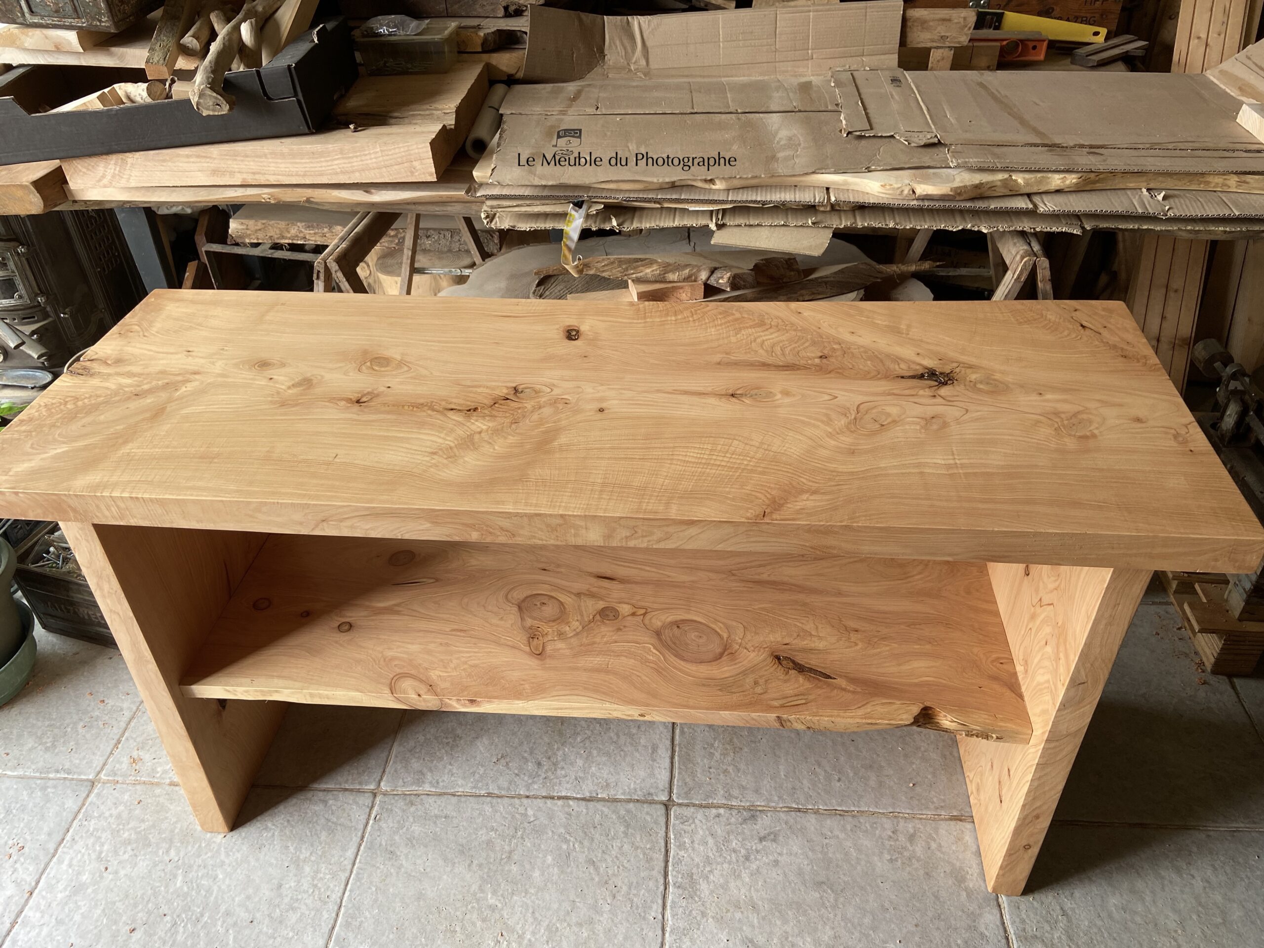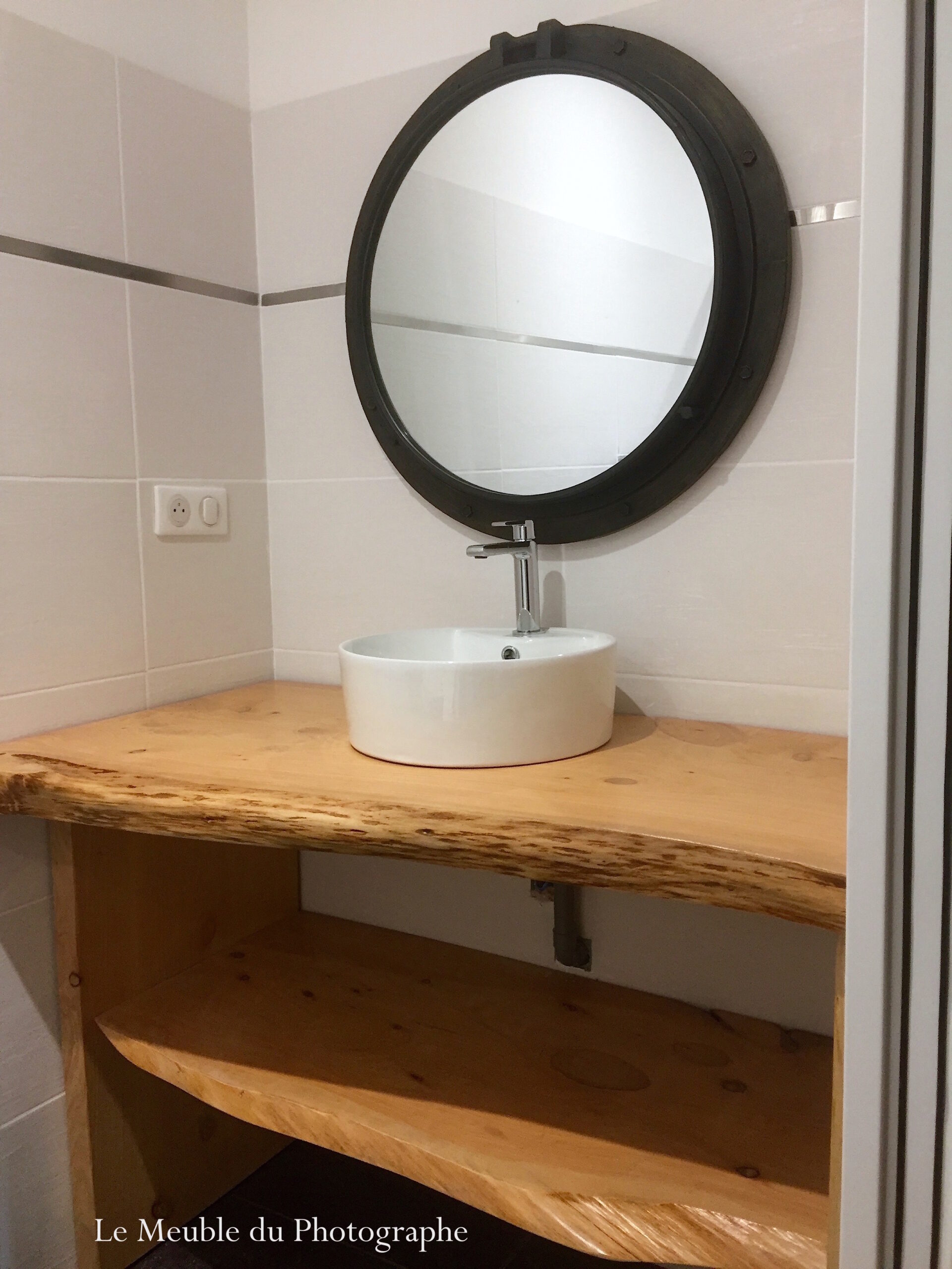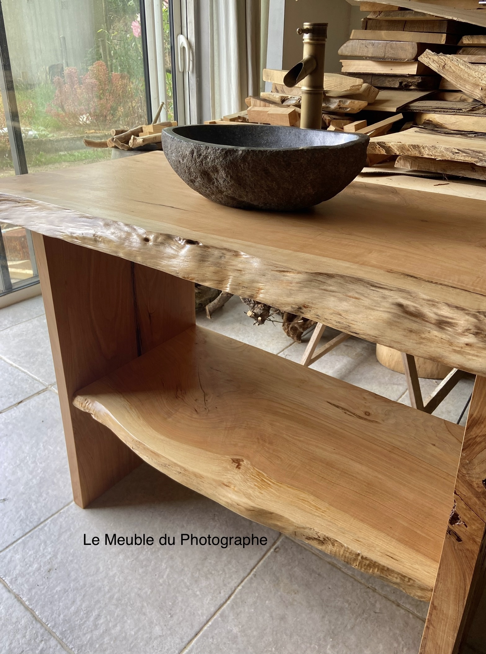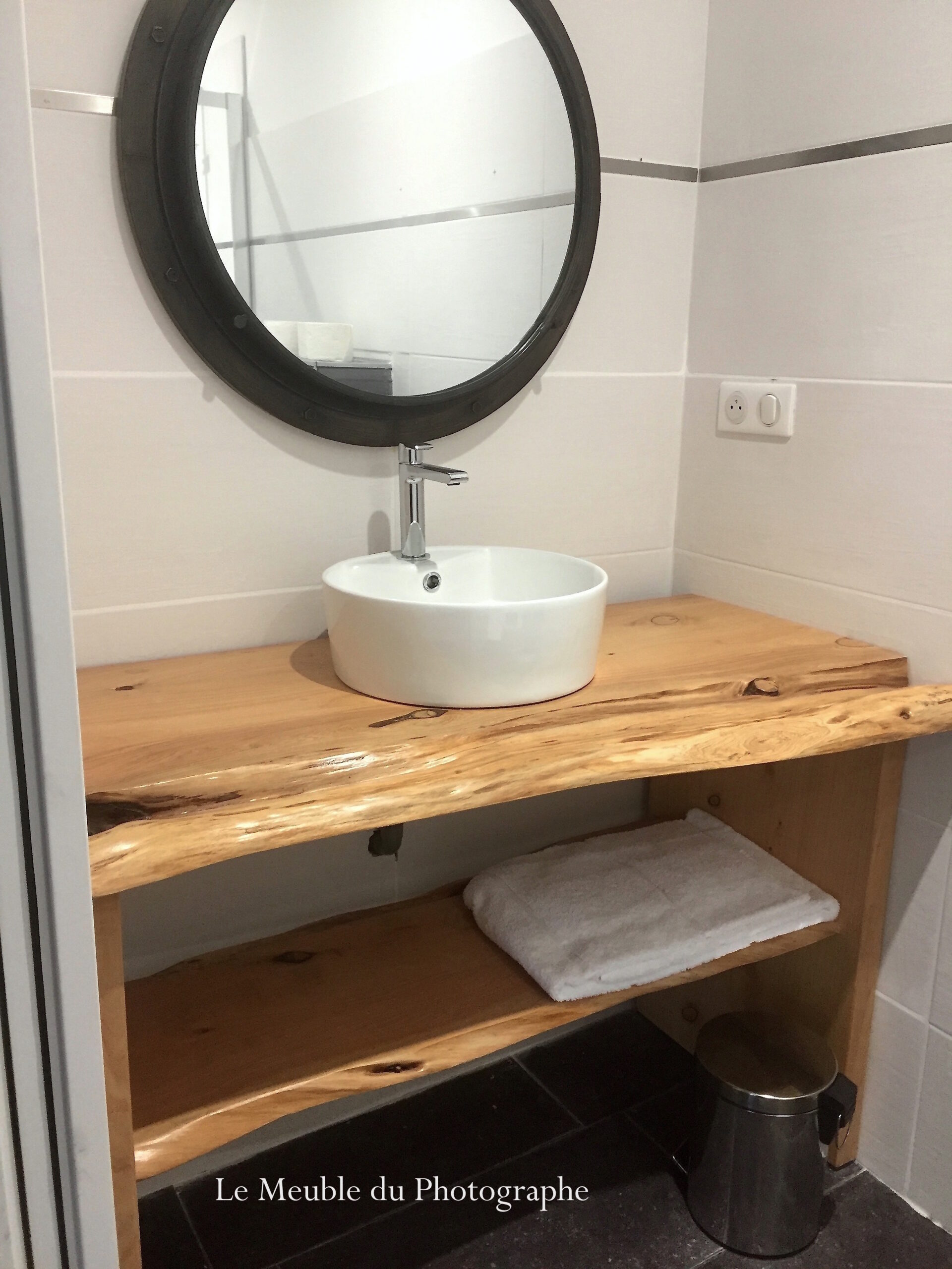 Ce meuble sous vasque est fabriqué sur mesure. Il s’agit en photos de bois massif de cyprès de Lambert, essence locale de Bretagne, protégé par vitrification. Il se compose d’une épaisse planche de bois massif non usinée (d’où sa forme arbre devant), d’une étagère porte serviettes sur le même principe et de 2 montants épais dans le même bois. Ces pieds ont ici été coupés droits plutôt qu’avec la forme irrégulière de l’arbre qui est travaillée à la main. Ils peuvent être à fleur du plateau ou en dedans. L’étagère centrale peut être coupée de forme droite à l’avant, ainsi que le plateau haut comme sur le dernier exemple commandé par un client. Le trou d’évacuation de votre vasque et robinetterie peuvent être réalisés sur demande.
