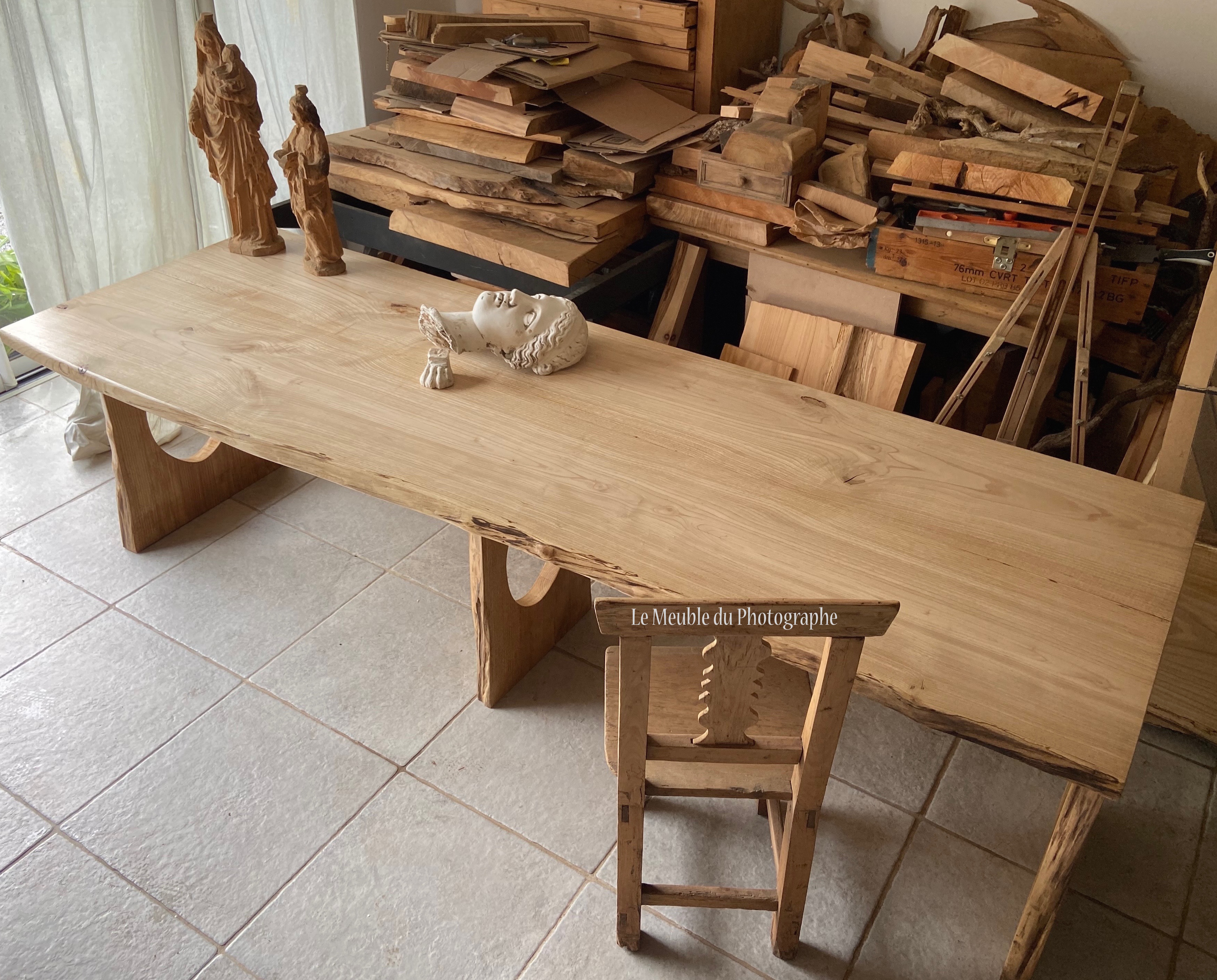 Selon le projet et la disponibilité des plateaux, je travaille différentes essences de bois massif : frêne, chêne, châtaignier, cyprès de Lambert, séquoia, pin Douglas, thuya…